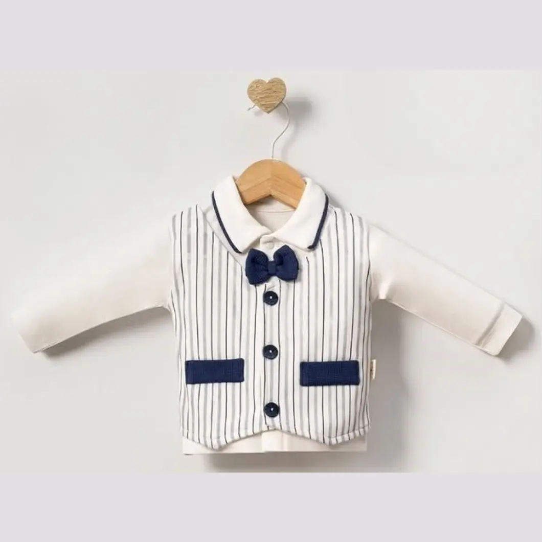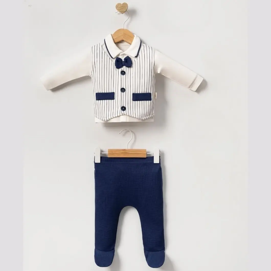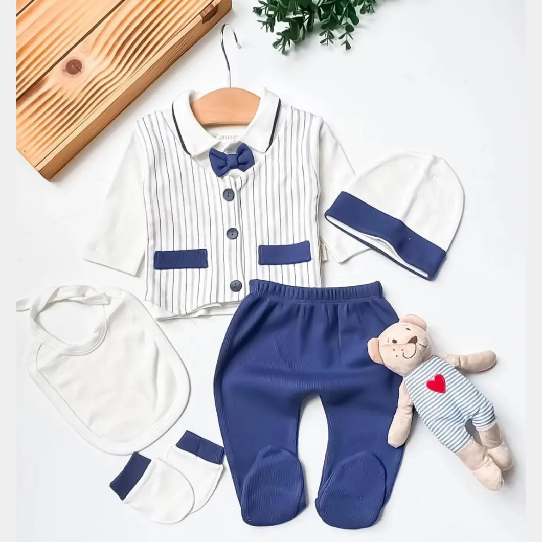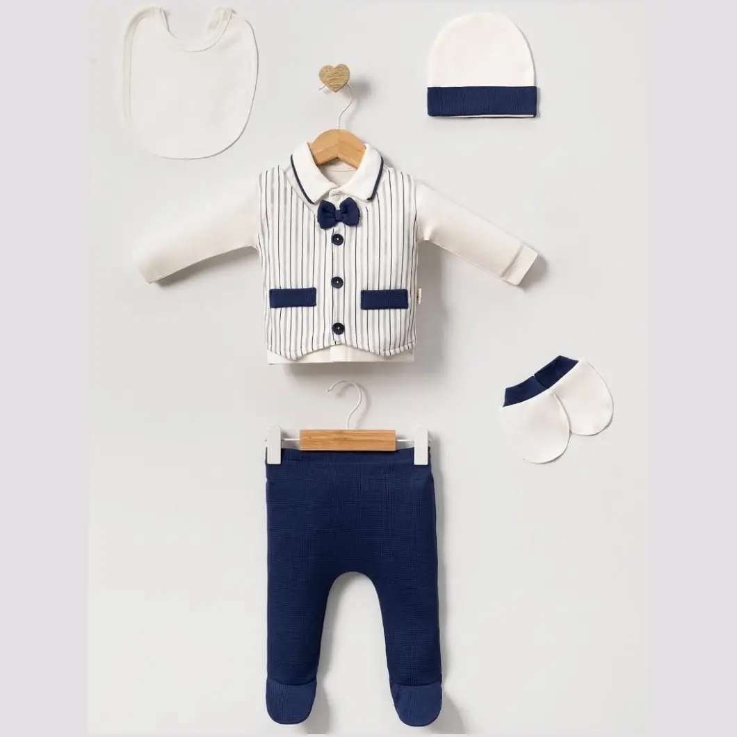 Set 5 piese pentru băieței, ideal pentru evenimente elegante sau momente speciale. Confectionat dintr-un material 100% bumbac, moale și plăcut la atingere, asigură confortul bebelușilor cu vârsta între 0 și 3 luni. Setul include: o bluză albă cu mânecă lungă și guler polo, cu închidere practică cu capse și o vestă elegantă cusută cu detalii de nasturi și un papion sofisticat; pantaloni lungi de culoare bleumarin, cu elastic în talie și botoșei integrați; o căciuliță albă cu mici detalii bleumarin; mănuși pentru protecție suplimentară și o bavetă albă. Acest set este perfect pentru a-l îmbrăca pe micuțul tău cu stil și eleganță.
