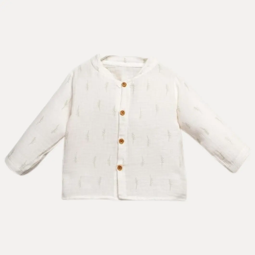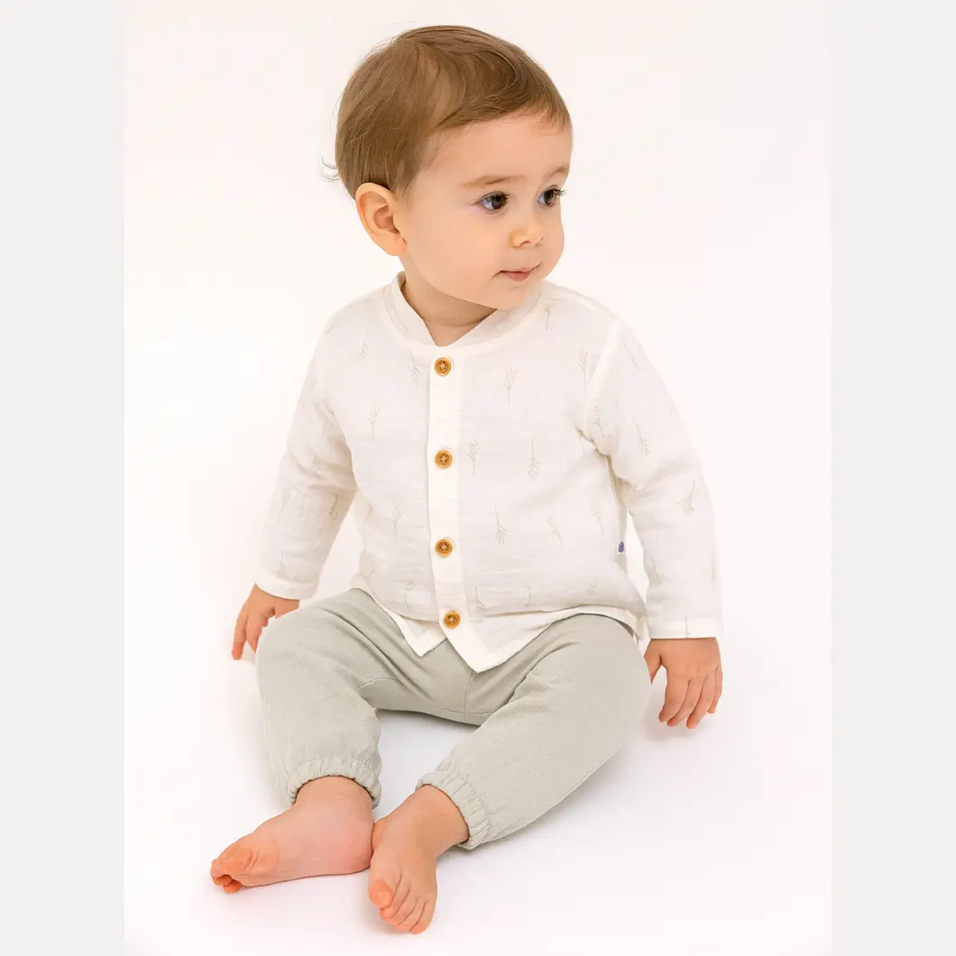 Compleul de 2 piese pentru băieței este realizat din 100% bumbac de calitate superioară, din material muselină, un material natural, lejer și respirabil, ideal pentru pielea delicată a bebelușilor. Setul include o cămașă cu mânecă lungă, cu închidere pe nasturi, în culoare ecru cu mici detalii de nuanță vernil, care adaugă un contrast elegant și jucăuș. Pantalonii lungi, de culoare vernil, sunt prevăzuți cu elastic în talie și la glezne, oferind confort și libertate de mișcare.