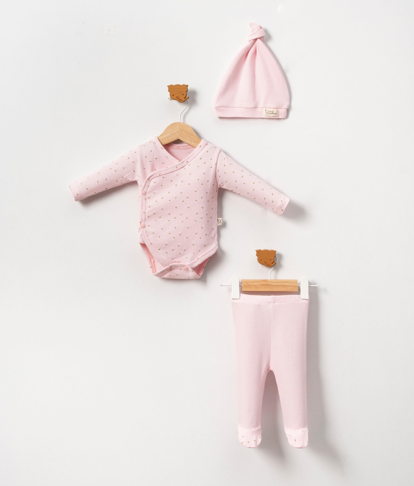 Pantalonul lung, de culoare roz deschis, vine cu botoșei integrați și elastic în talie pentru o potrivire perfectă și confortabilă. Setul este completat de o caciuliță asortată, fabricată tot din bumbac 100%, ideală pentru a menține căldura și a adăuga un plus de farmec.