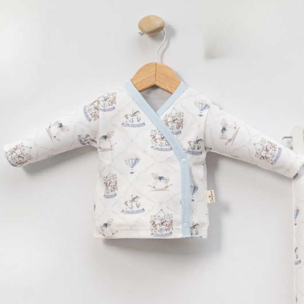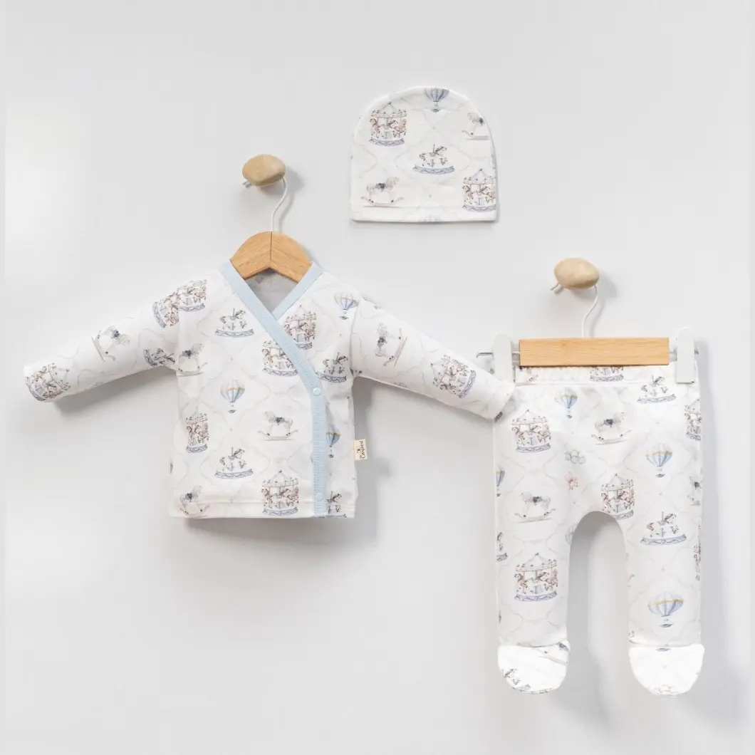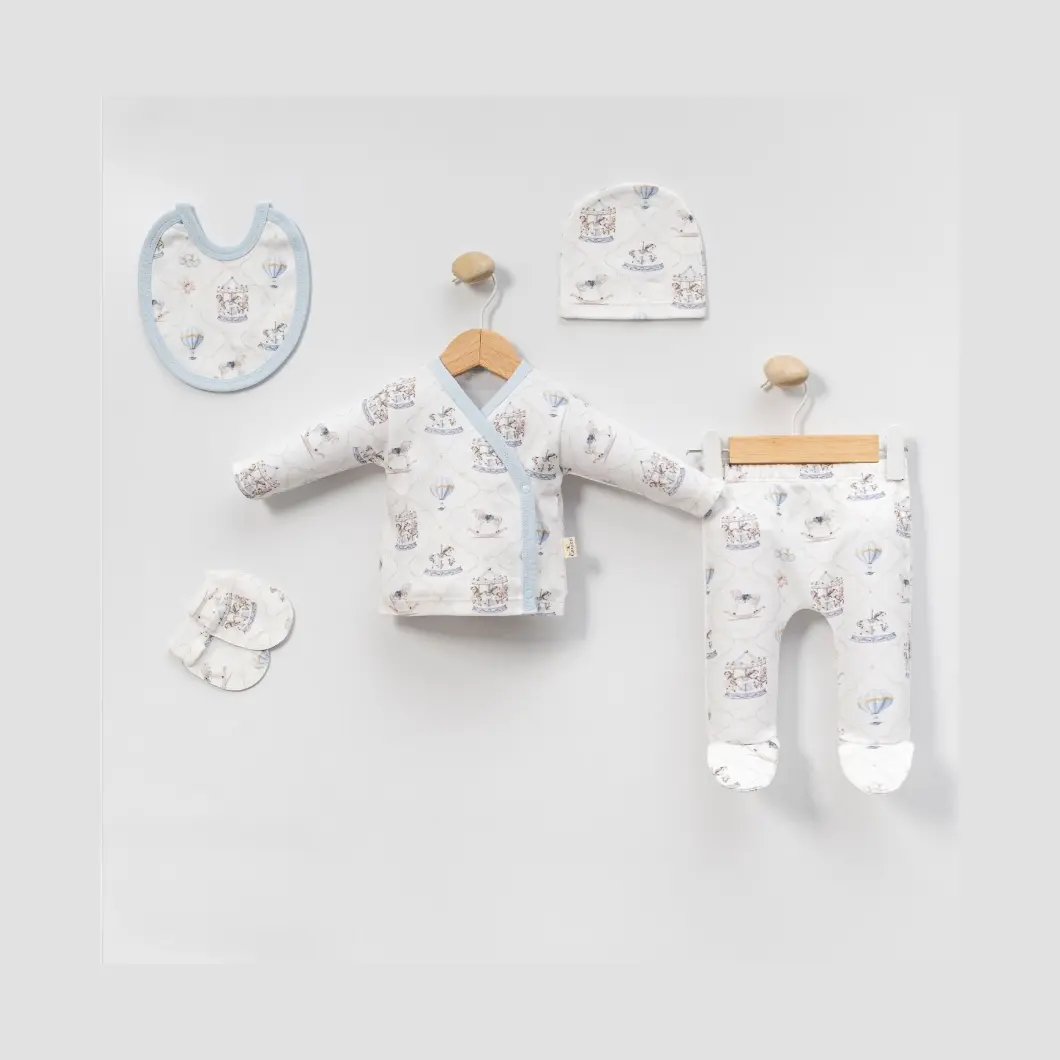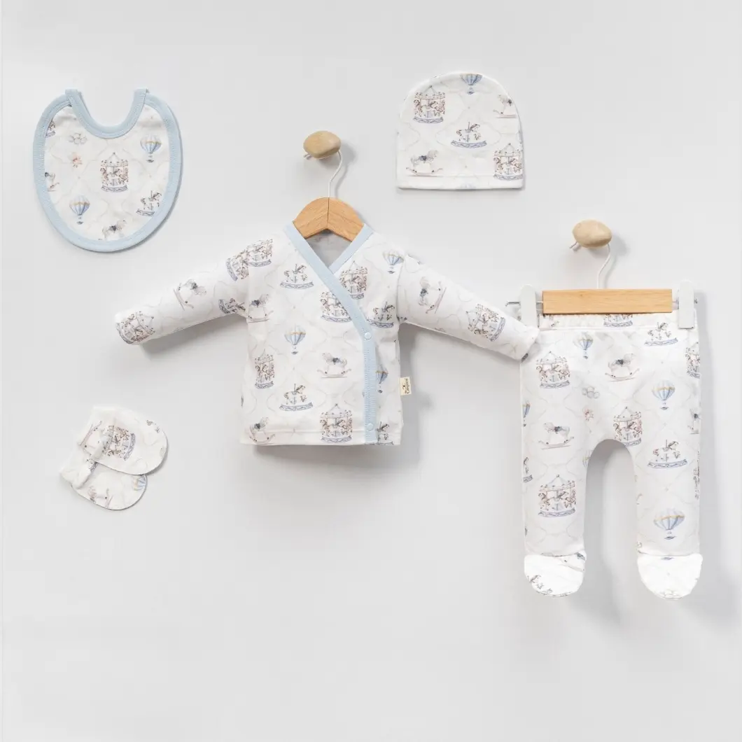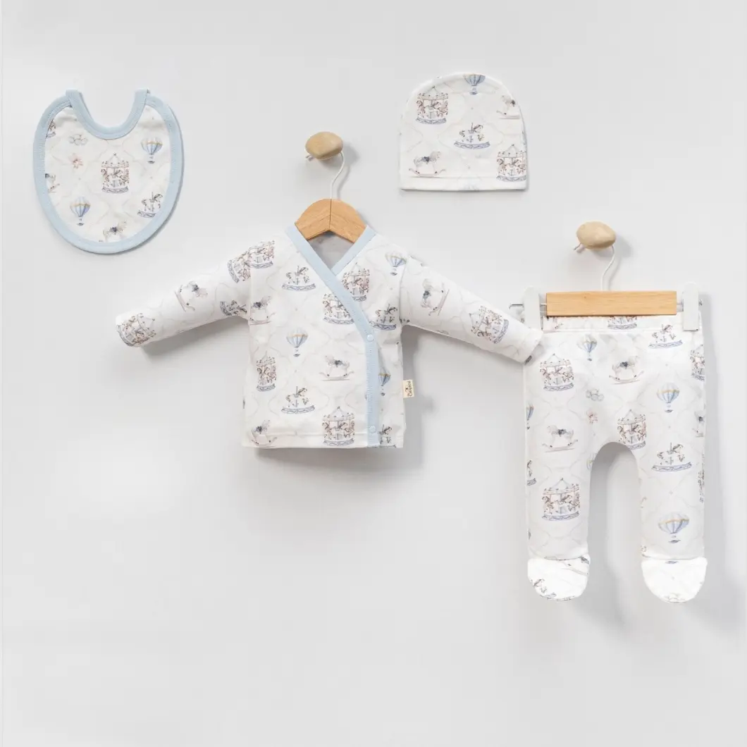 Designul cu imprimeu delicat inspirat din universul copilăriei – carusel, baloane cu aer cald și nuanțe blânde de albastru – transformă acest set într-o alegere practică, dar și estetică. Croiala este lejeră, adaptată pentru schimbări rapide, iar piesele sunt gândite să acopere nevoile esențiale ale unui nou-născut, atât ziua, cât și noaptea.