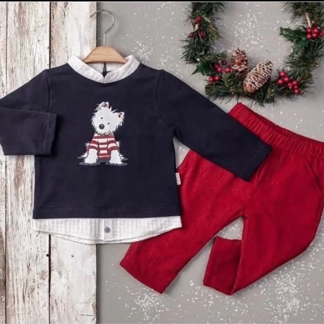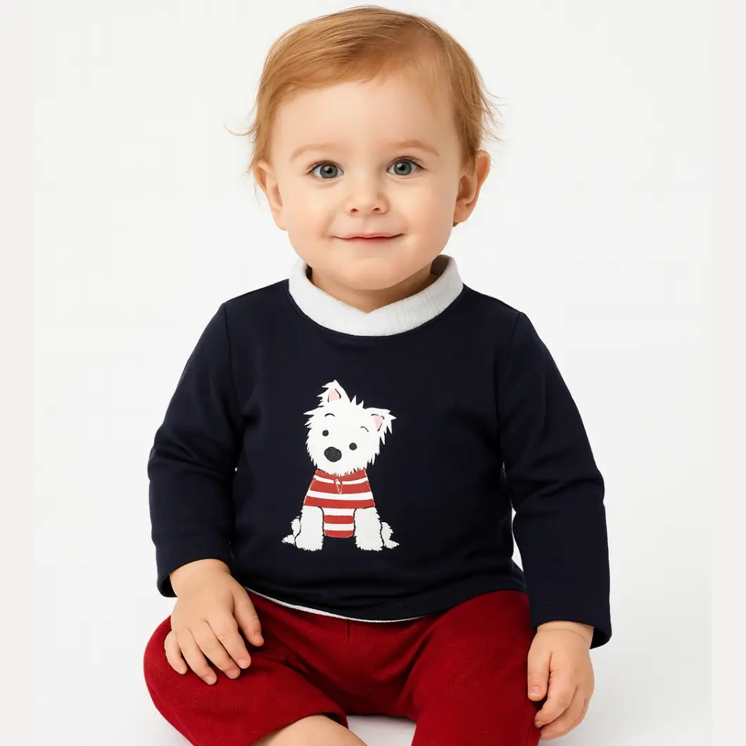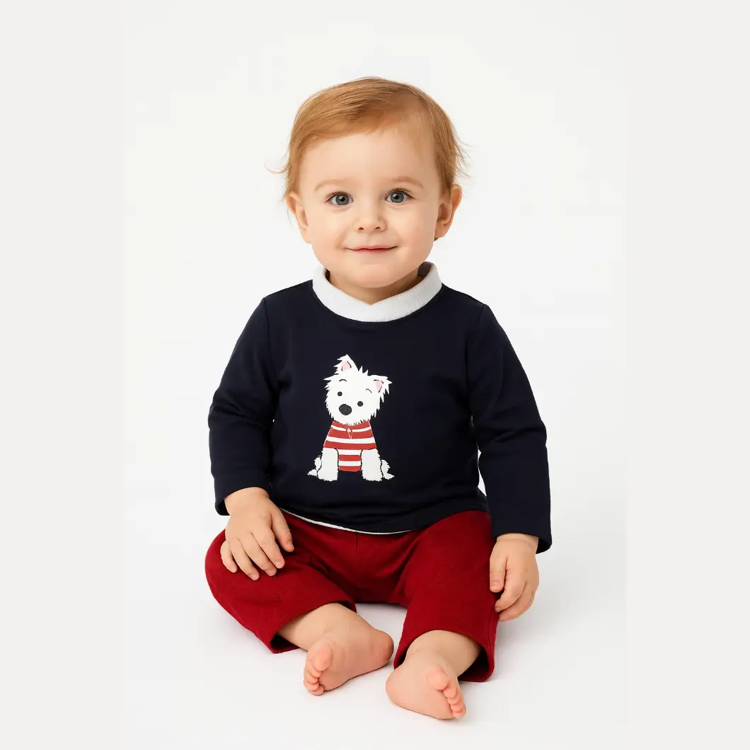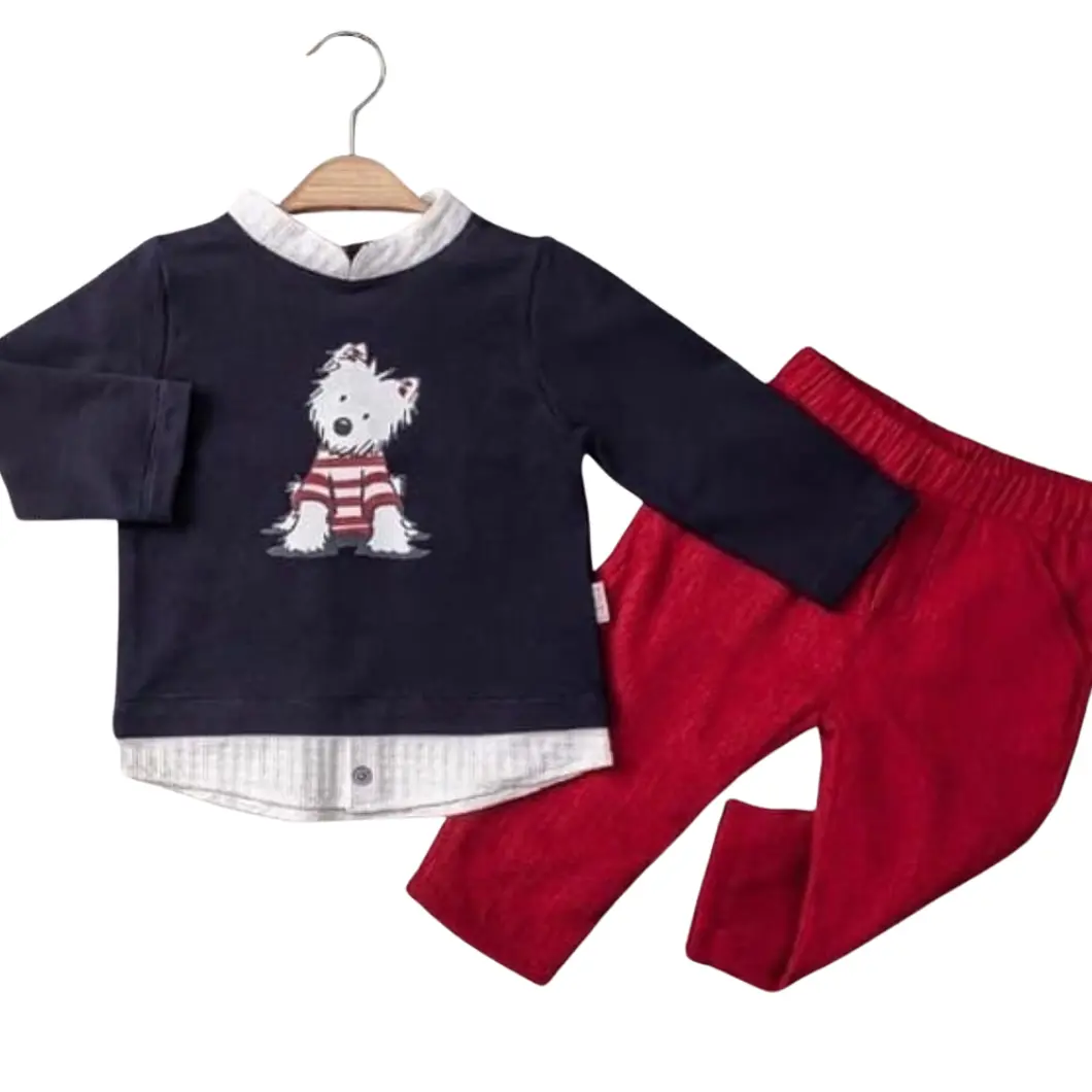 Compleul adorabil din două piese, fabricat 100% din bumbac, este alegerea perfectă pentru zilele răcoroase. Bluza cu mânecă lungă de culoare bleumarin are un design elegant, cu un guler brodat alb care îi oferă un farmec aparte, completat de o bandă de broderie albă aplicată în talie. Imprimeul cu cățeluș adaugă o notă jucăușă și prietenoasă, ideală pentru micuțII iubitoarI de animale. Bluza se închide la spate cu doi năsturei, facilitând îmbrăcarea rapidă. Pantalonii lungi, de un roșu intens, sunt confecționați din material reiat, având o dublură interioară pentru confort și căldură. Cu elastic în talie și două buzunare laterale, pantalonii oferă un look practic și stilat. Acest compleu este varianta ideală pentru un stil chic și confortabil.