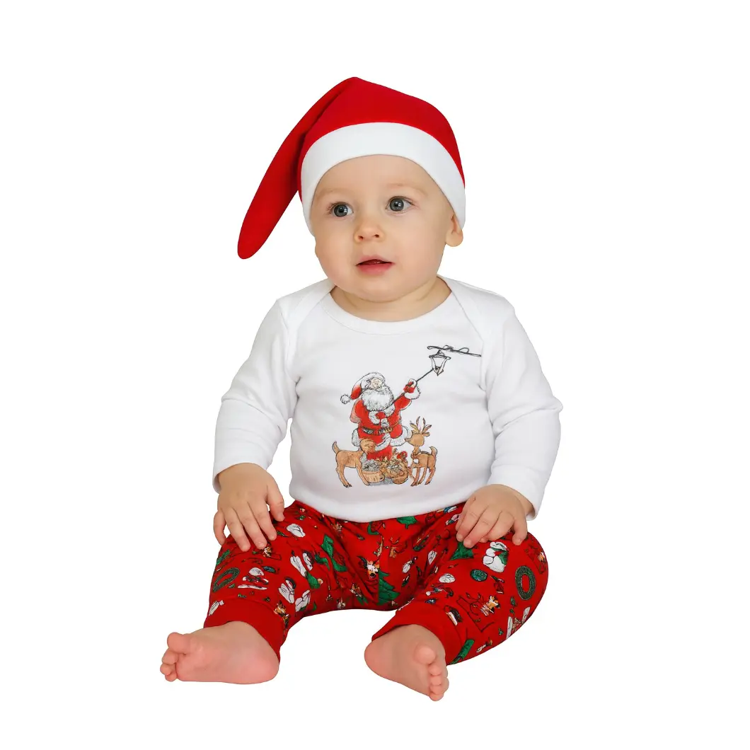 Setul adorabil de Crăciun, realizat 100% din bumbac, este format din trei piese perfecte pentru sezonul sărbătorilor. Body-ul alb cu mânecă lungă este decorat cu un imprimeu simpatic ce-l prezintă pe Moș Crăciun și renii săi, aducând un aer festiv și vesel. Body-ul are o închidere practică cu capse între picioare, facilitând îmbrăcarea și schimbarea scutecului. Pantalonii lungi, de culoare roșie, sunt decorați cu printuri de Crăciun ce includ Moș Crăciun, sania lui, oameni de zăpadă și brăduți, iar elasticul din talie și la glezne asigură o potrivire confortabilă. Căciulița roșie, cu o bandă albă, completează perfect setul, oferindu-i micuțului un look festiv și călduros. Ideal pentru a surprinde magia Crăciunului în fiecare poză și moment.