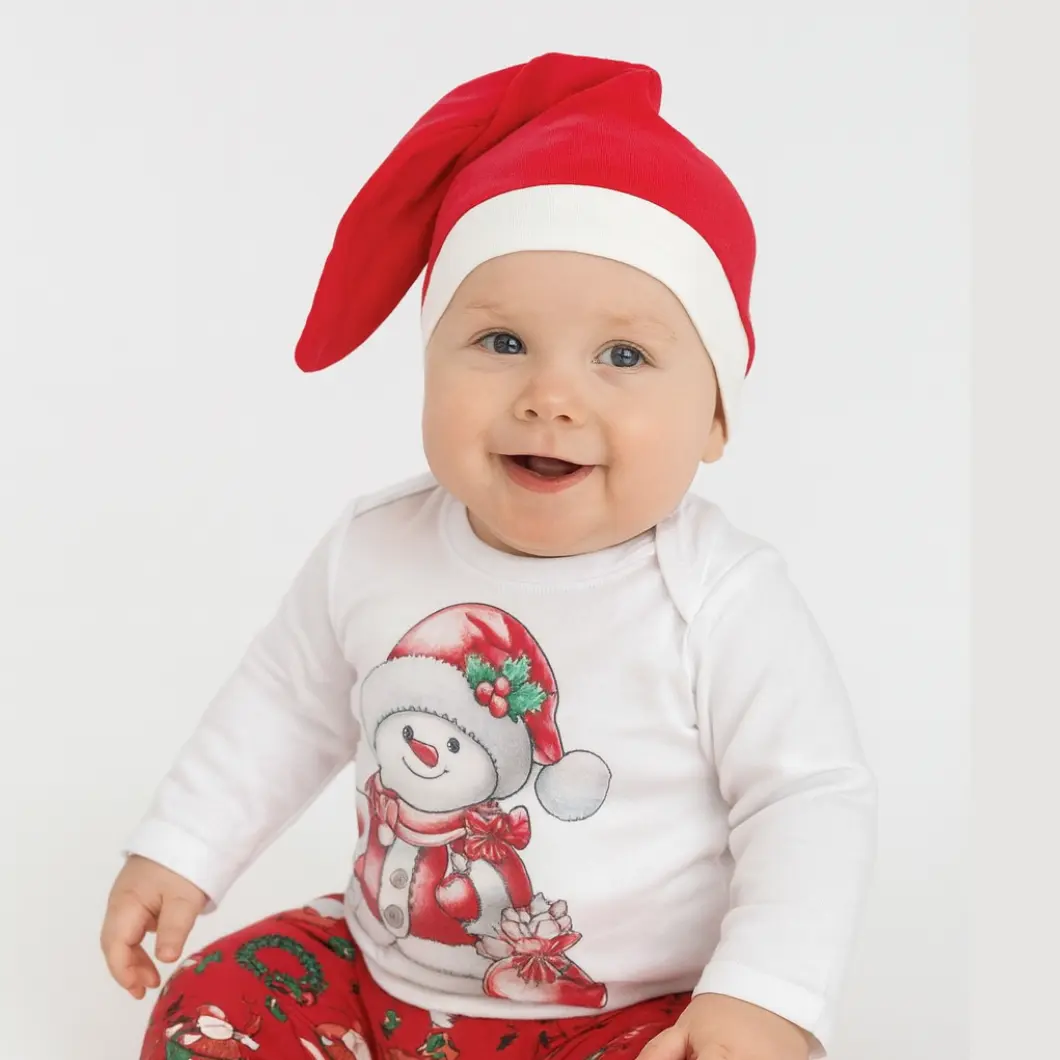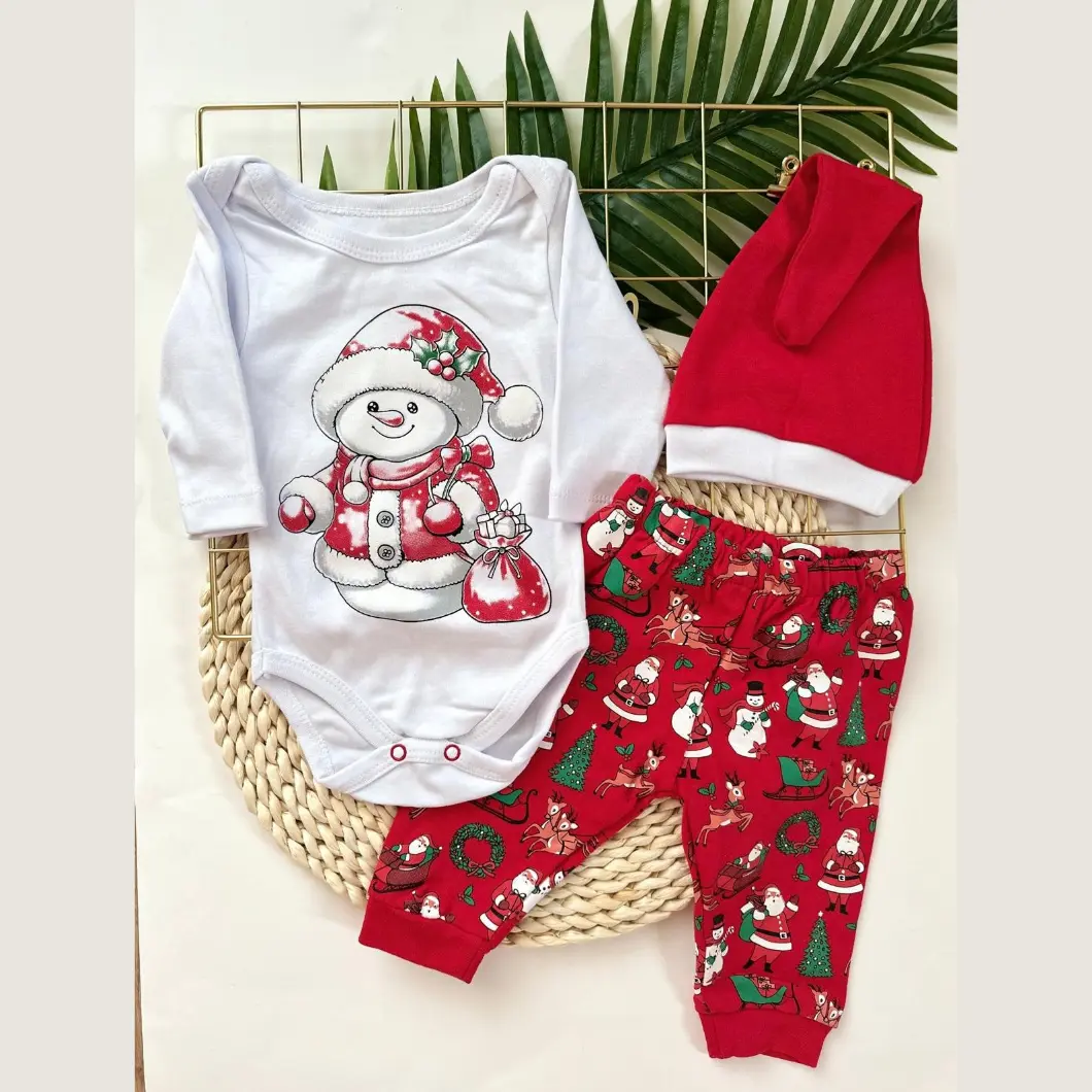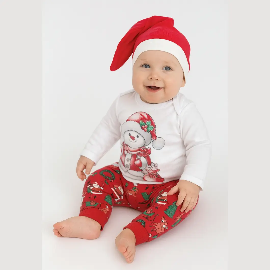 Setul "Snowman" este perfect pentru sărbătorile de iarnă, aducând un plus de magie și veselie garderobei celui mic. Format din 3 piese, acest set este ideal pentru evenimente speciale, ședințe foto sau momente festive. Body-ul alb cu mânecă lungă este decorat cu un imprimeu simpatic cu Om de Zăpadă și are închidere practică cu capse, oferind confort și ușurință în utilizare. Căciulița roșie completează perfect tematica festivă, fiind moale și călduroasă. Pantalonii lungi de culoare roșie, cu imprimeu specific de Crăciun, au elastic în talie și la gleznă, asigurând o potrivire confortabilă și o libertate de mișcare sporită. Materialele de calitate garantează un set plăcut la atingere și ideal pentru pielea sensibilă a bebelușilor.