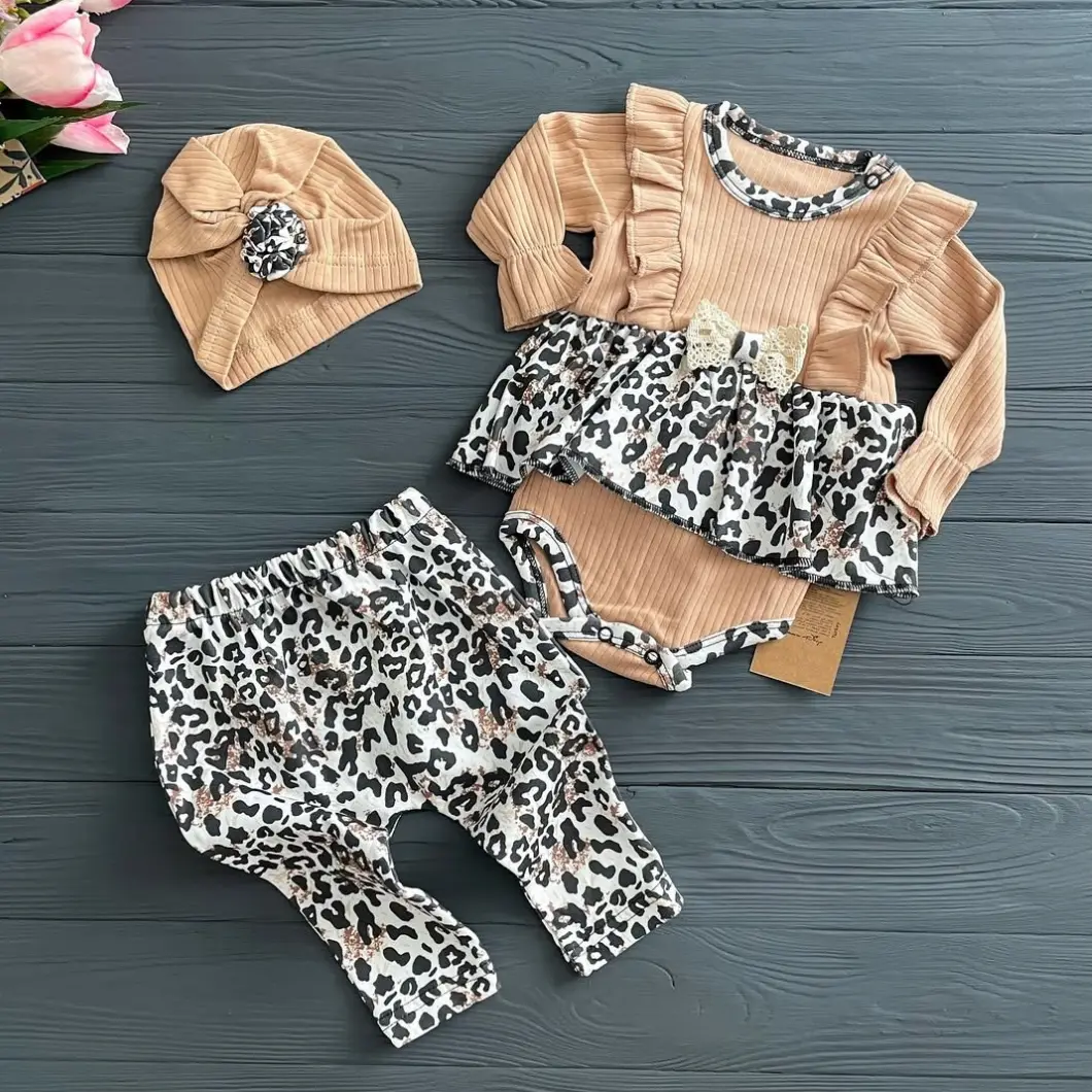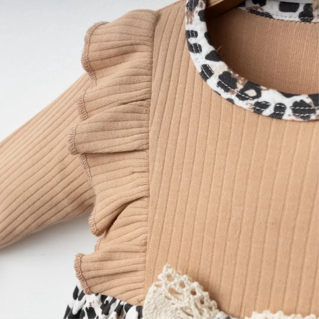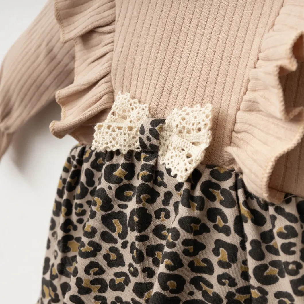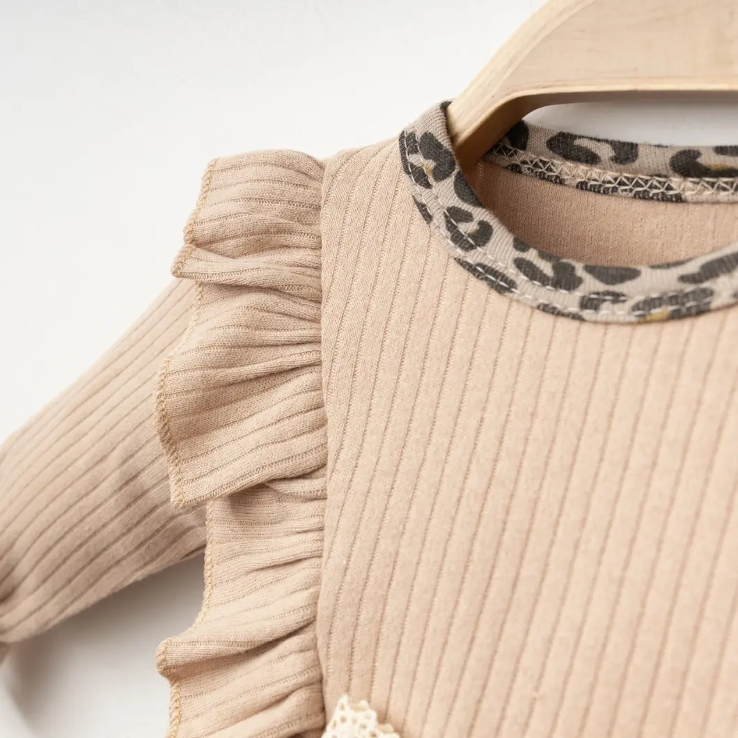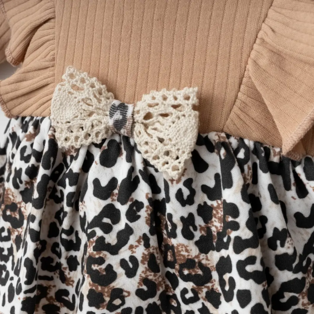 Body-ul cu mânecă lungă are o culoare caldă, capuccino, perfectă pentru sezonul rece. Detaliile sale elegante includ volănașe pe umeri, piept și mâneci, aducând un aer adorabil și sofisticat. Pe talie, body-ul este decorat cu un volănaș cu imprimeu leopard și o fundiță delicată aplicată, care completează look-ul chic. Închiderea body-ului se face cu capse poziționate la umăr și între picioare, facilitând îmbrăcarea și schimbarea scutecului.