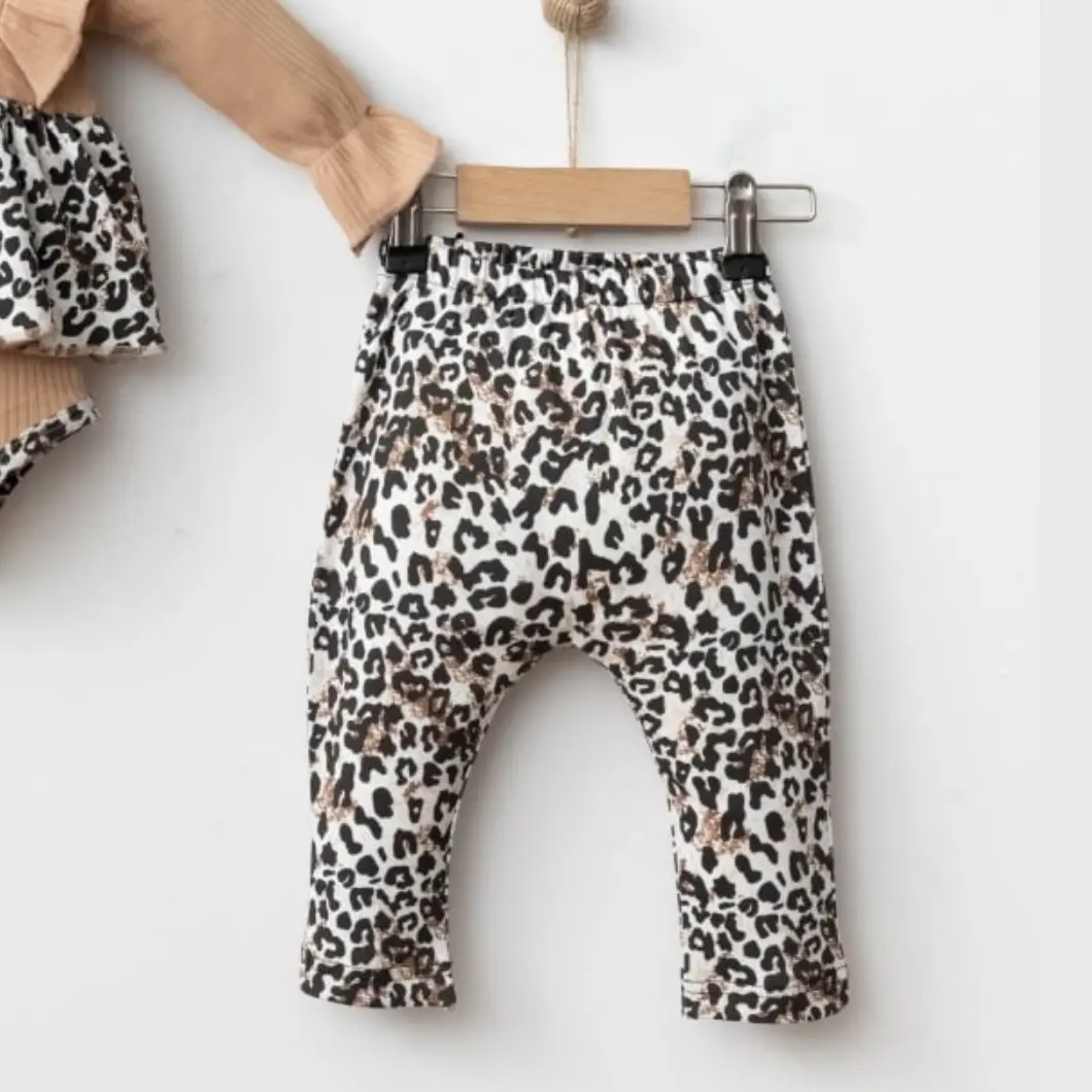 Pantalonii lungi cu imprimeu leopard au talie elastică și elastic la glezne, asigurând o potrivire confortabilă și flexibilă pentru bebelușul tău. Acest imprimeu jucăuș și modern adaugă personalitate ținutei, făcând-o potrivită atât pentru ocazii speciale, cât și pentru purtarea zilnică.