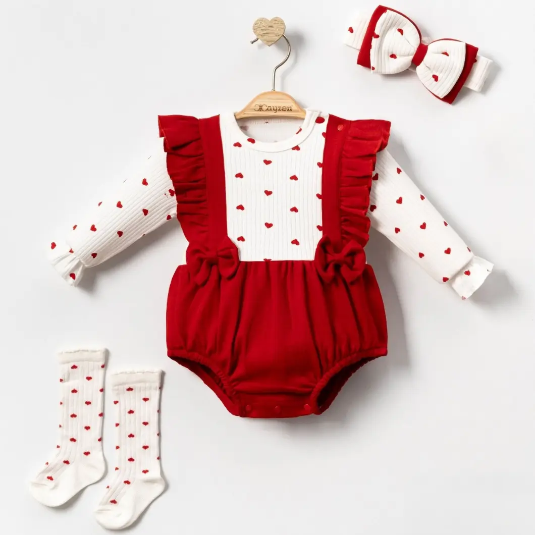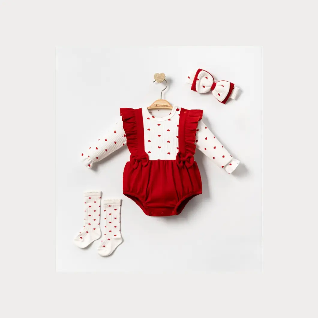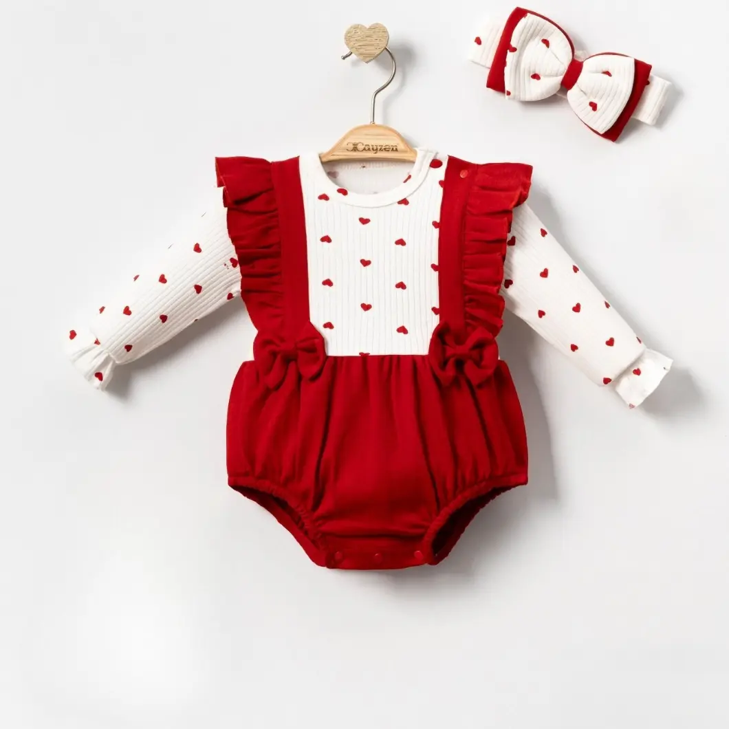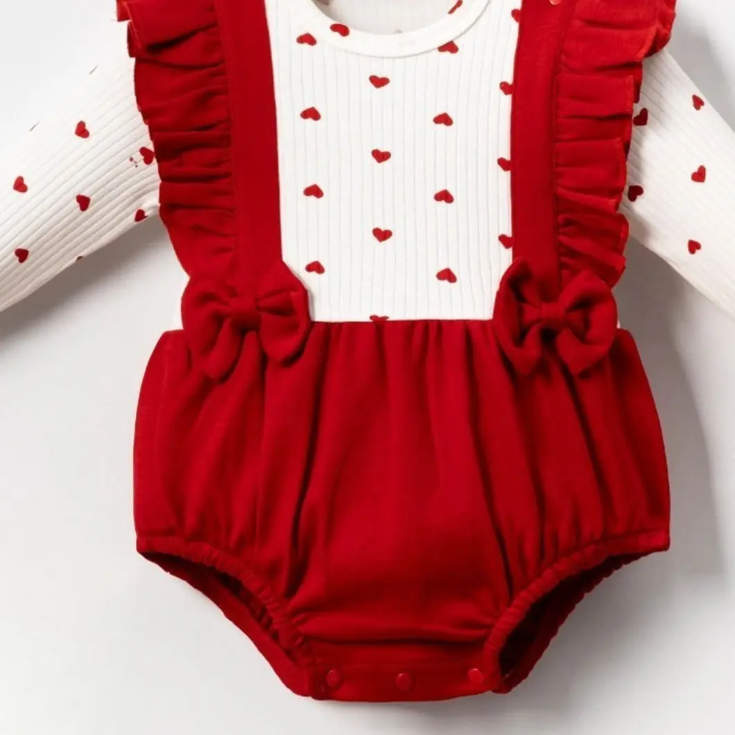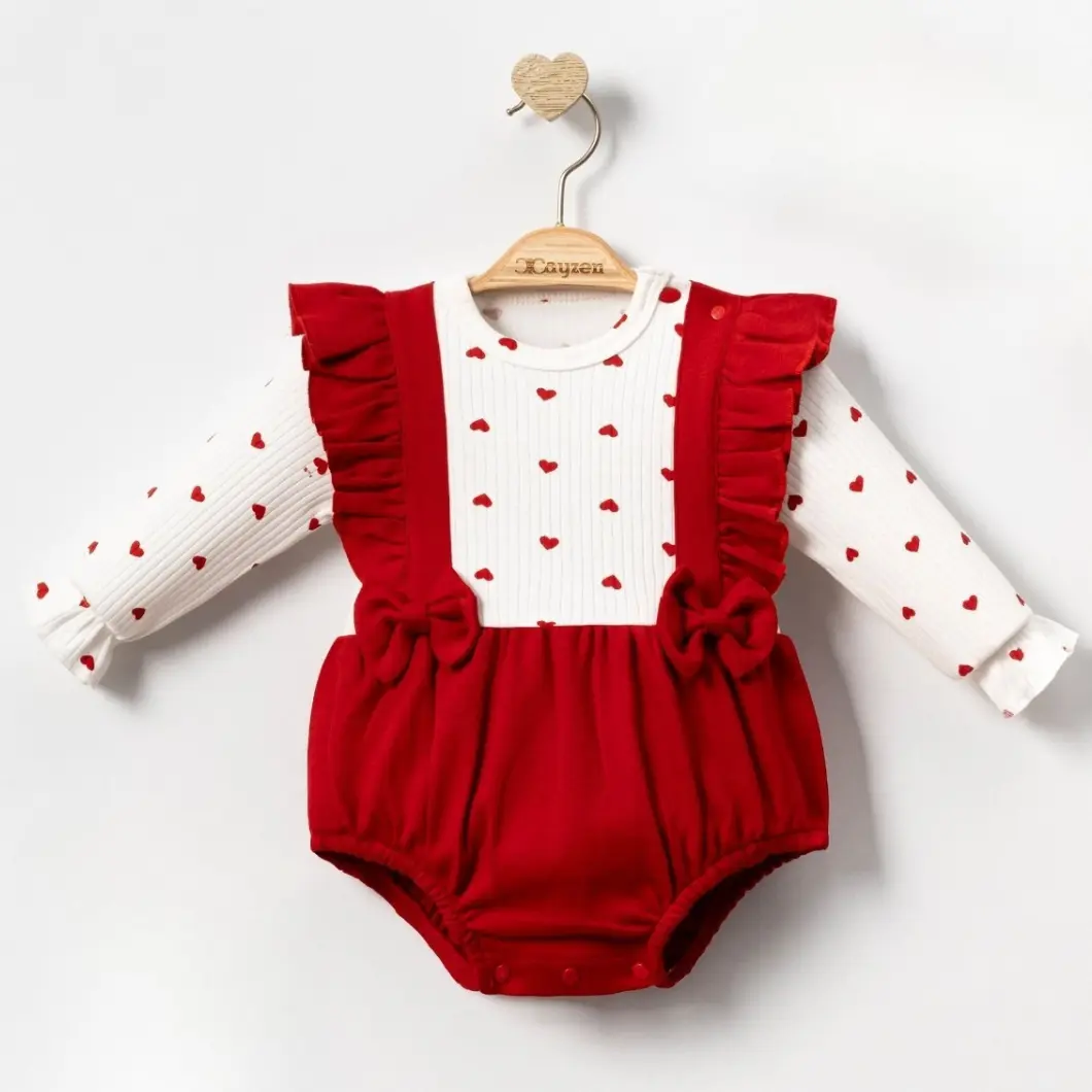 Designul cu inimioare discrete și volănașe aplicate oferă un aer feminin și delicat, fără a incomoda copilul. Închiderea cu capse la gât și între picioare facilitează schimbările rapide, esențiale în rutina zilnică. Este un set potrivit atât pentru purtare zilnică, cât și pentru evenimente speciale, vizite sau ședințe foto.