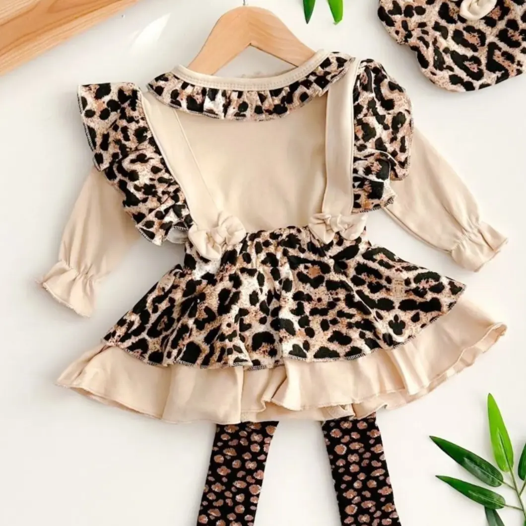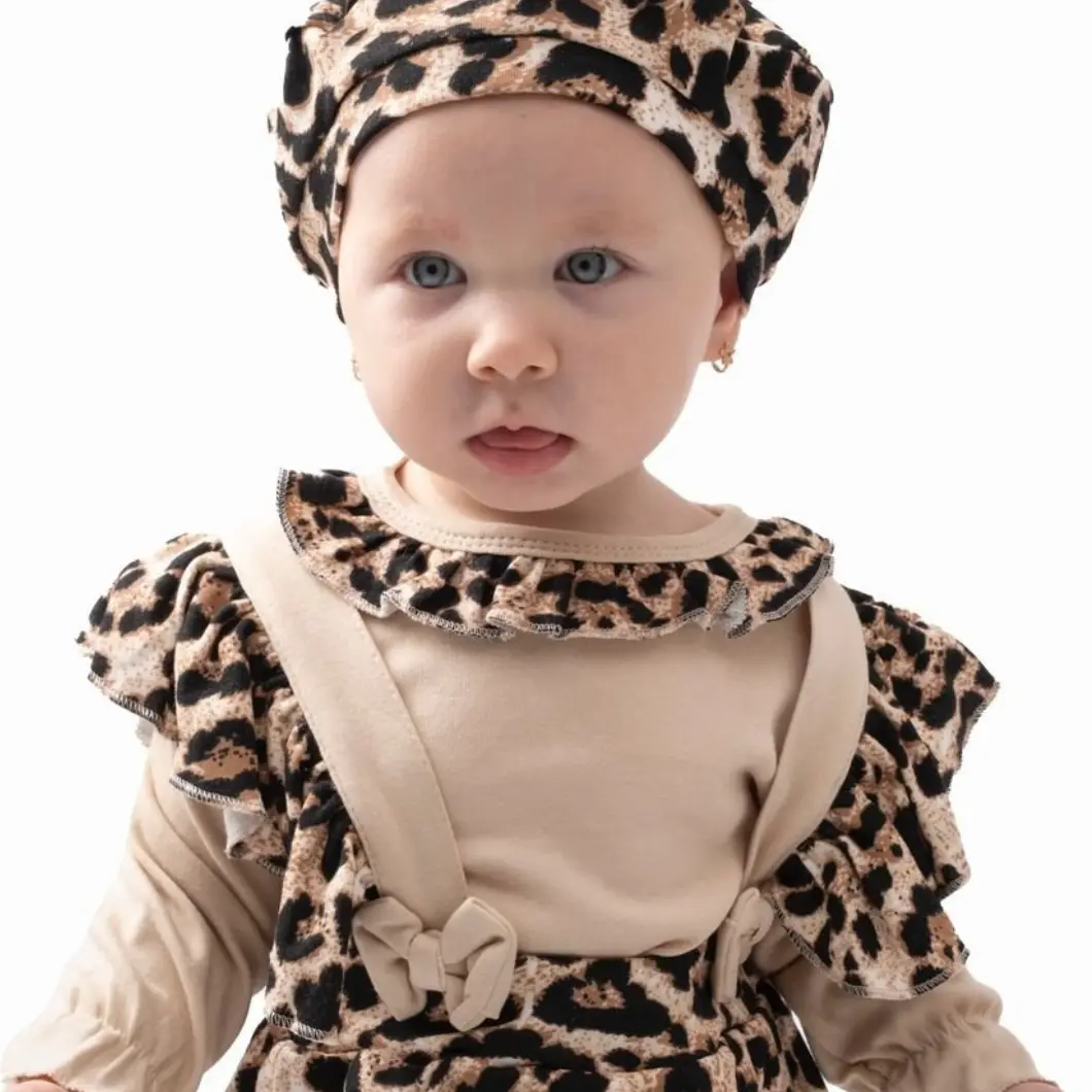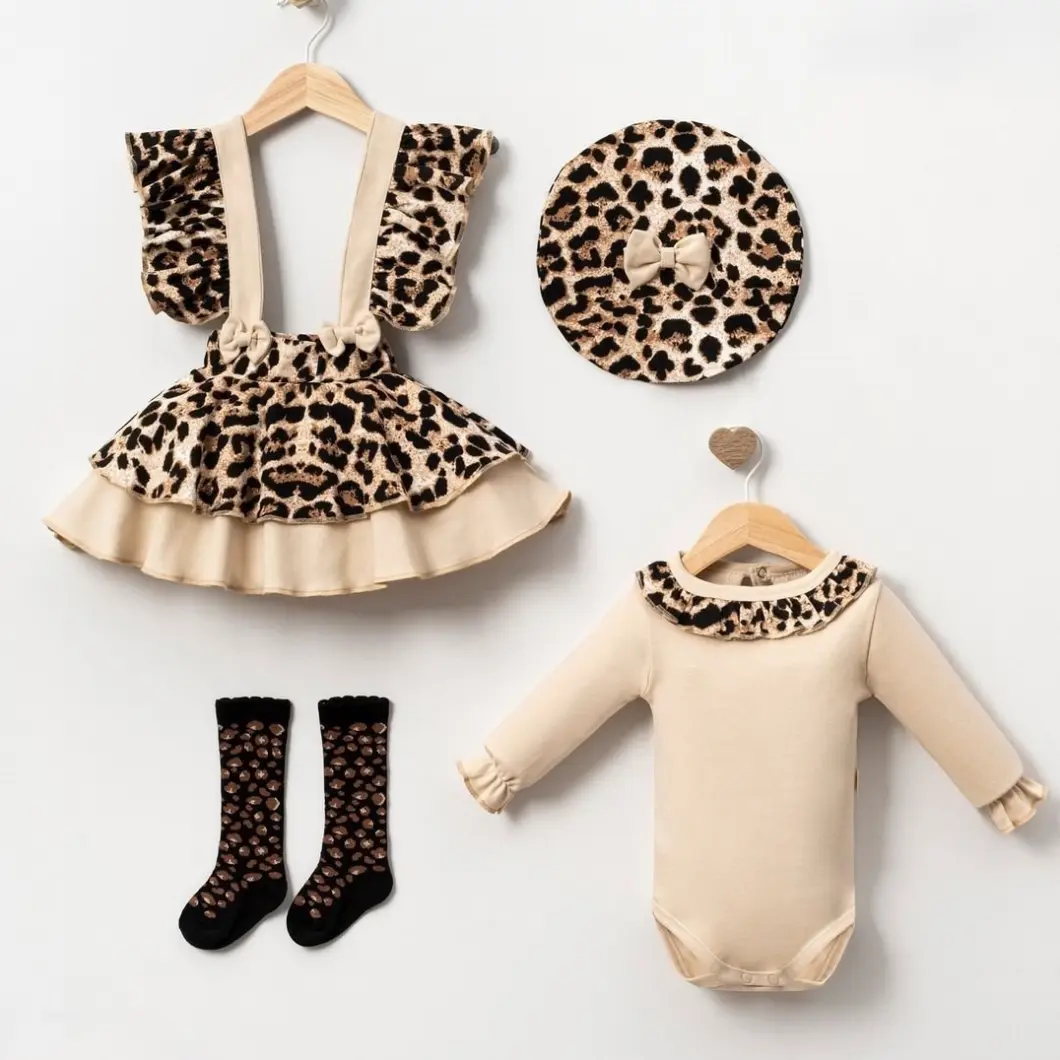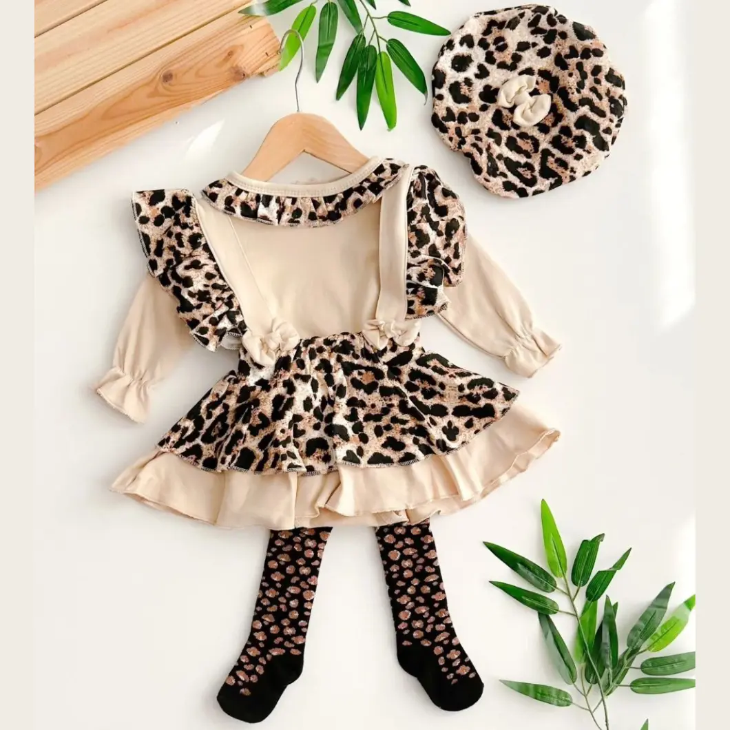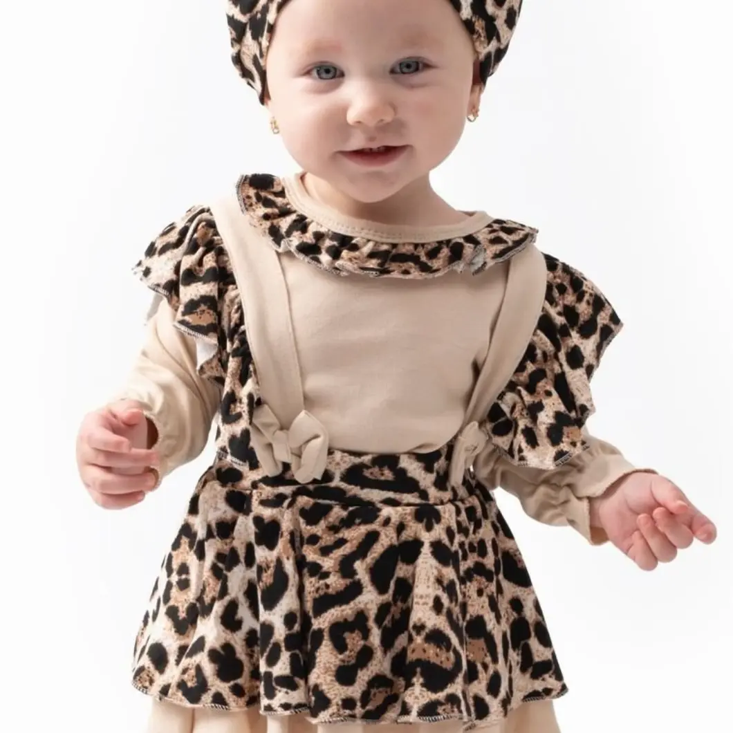 Transform-o pe micuța ta într-o adevărată fashionistă cu acest set de 4 piese! Confecționat din bumbac 100% moale și plăcut la atingere, acest set este perfect pentru zilele în care vrei să o răsfeți. Rochița tip salopetă, cu imprimeu leopard îndrăzneț și volane delicate, îi va oferi un look chic și jucăuș. Body-ul cu mânecă lungă și căciulița asortată completează ținuta, creând un ansamblu elegant și confortabil. Perfect pentru o ședință foto, o aniversare sau orice altă ocazie specială.
