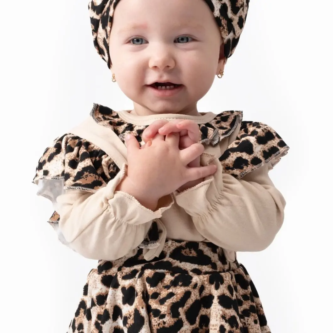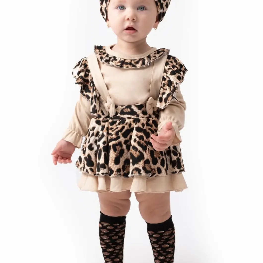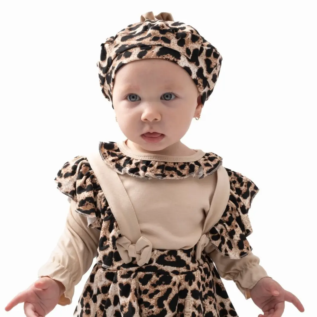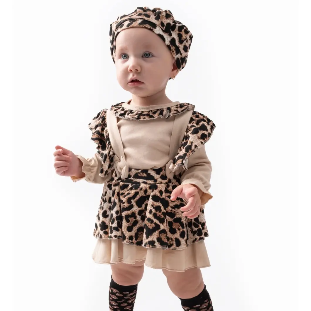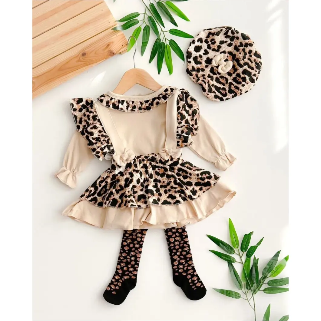 Transform-o pe micuța ta într-o adevărată fashionistă cu acest set de 4 piese! Confecționat din bumbac 100% moale și plăcut la atingere, acest set este perfect pentru zilele în care vrei să o răsfeți. Rochița tip salopetă, cu imprimeu leopard îndrăzneț și volane delicate, îi va oferi un look chic și jucăuș. Body-ul cu mânecă lungă și căciulița asortată completează ținuta, creând un ansamblu elegant și confortabil. Perfect pentru o ședință foto, o aniversare sau orice altă ocazie specială.