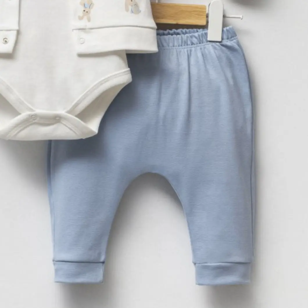 Hanoracul alb cu urechiușe aplicate și imprimeu vesel cu iepurași aduce o notă jucăușă fiecărei ținute, body-ul cu mânecă lungă și închidere cu capse la umăr și între picioare asigură îmbrăcarea rapidă, iar pantalonii bleu cu talie și glezne elastice oferă libertate totală de mișcare.
