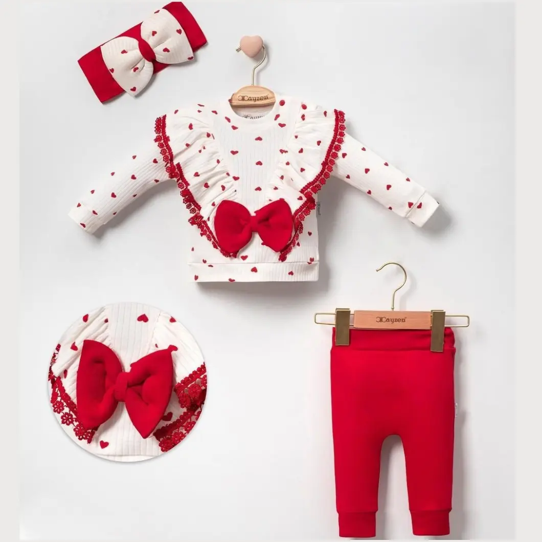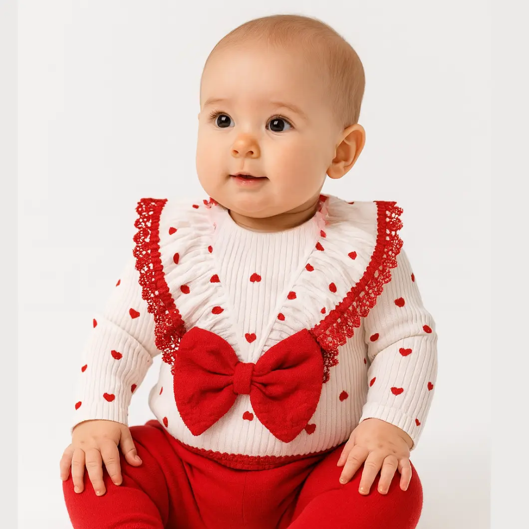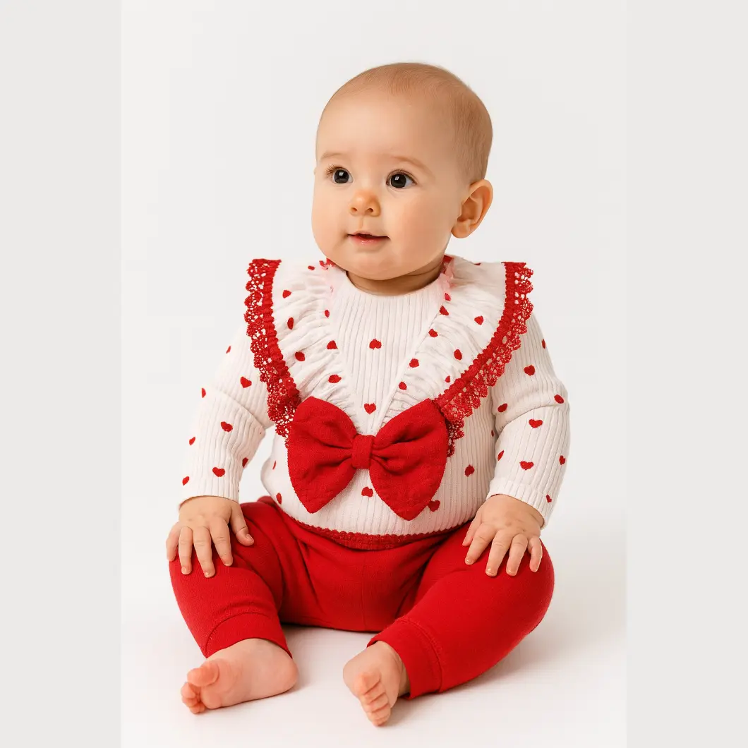 Acest set adorabil de 3 piese pentru fetițe, confecționat 100% din bumbac, aduce un aer romantic și vesel, perfect pentru momente speciale. Setul include o bluză albă cu mânecă lungă, decorată cu inimioare roșii imprimate și un volan de dantelă roșie. În centrul bluzei, o fundiță mare, roșie, completează designul cu o notă elegantă. Pantalonii roșii sunt elastici, oferind o potrivire confortabilă pentru micuța ta. Setul este completat de o bentiță asortată, cu același imprimeu de inimioare și fundiță, pentru un look complet adorabil și coordonat. Materialul de bumbac este moale și prietenos cu pielea delicată a copilului, făcând acest set ideal pentru ținute de ocazie sau pentru purtarea de zi cu zi în sezonul rece.