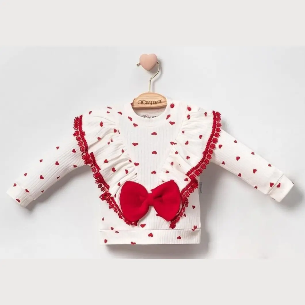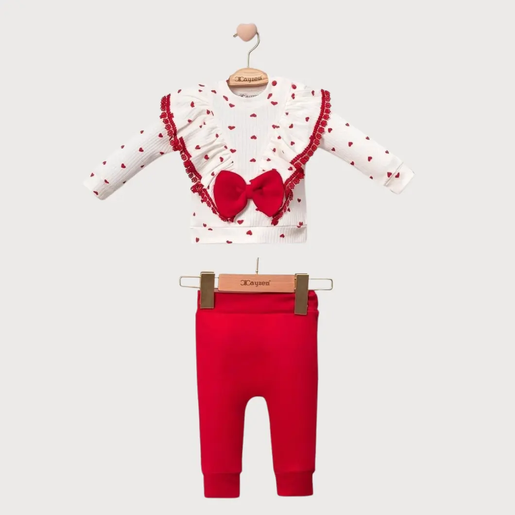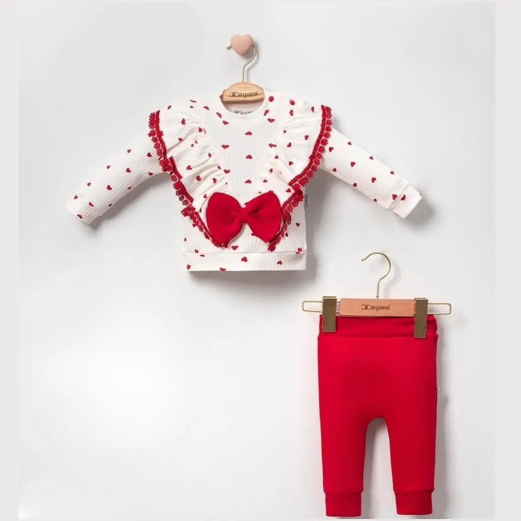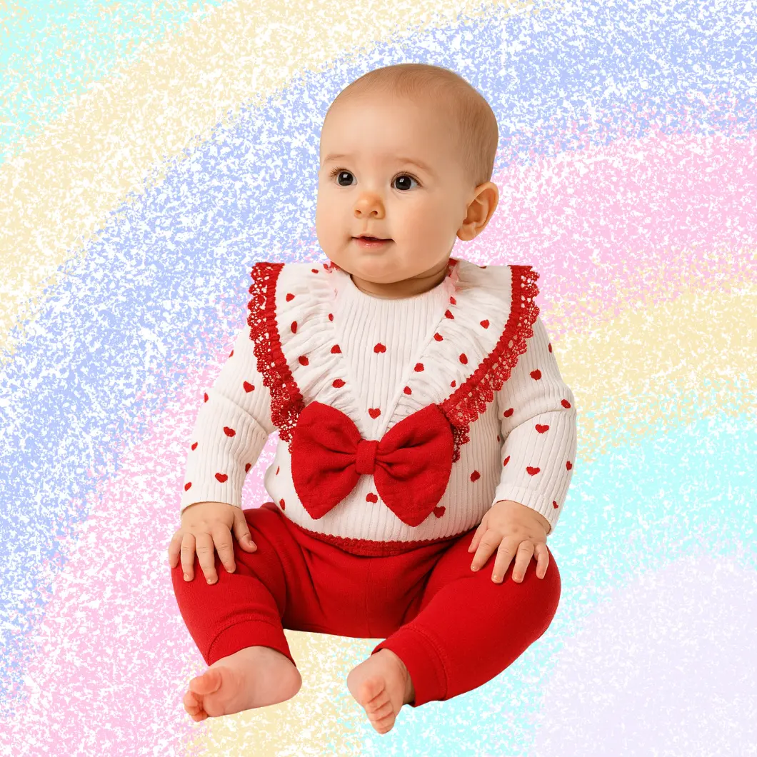 Acest set adorabil de 3 piese pentru fetițe, confecționat 100% din bumbac, aduce un aer romantic și vesel, perfect pentru momente speciale. Setul include o bluză albă cu mânecă lungă, decorată cu inimioare roșii imprimate și un volan de dantelă roșie. În centrul bluzei, o fundiță mare, roșie, completează designul cu o notă elegantă. Pantalonii roșii sunt elastici, oferind o potrivire confortabilă pentru micuța ta. Setul este completat de o bentiță asortată, cu același imprimeu de inimioare și fundiță, pentru un look complet adorabil și coordonat. Materialul de bumbac este moale și prietenos cu pielea delicată a copilului, făcând acest set ideal pentru ținute de ocazie sau pentru purtarea de zi cu zi în sezonul rece.