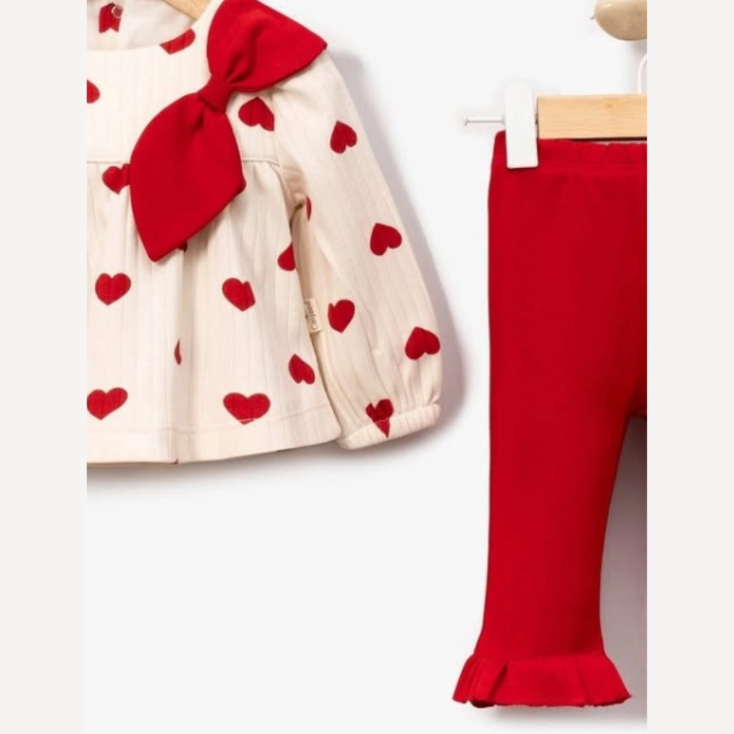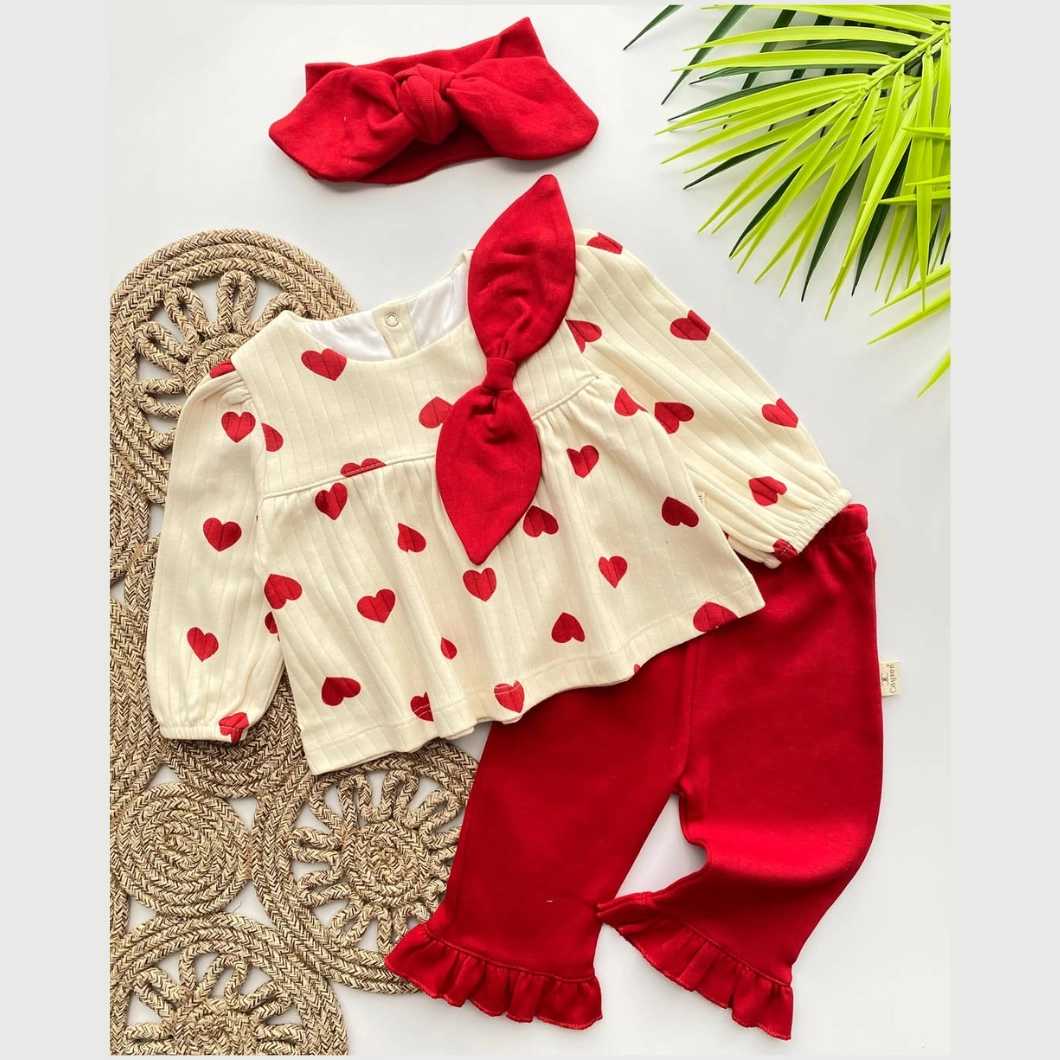 ✔️ Bluză alb-crem cu inimioare roșii și fundiță mare aplicată – un detaliu chic pentru un look de poveste